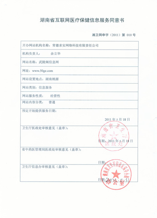 2011年5月31日,我公司獲湖南省衛(wèi)生廳批準(zhǔn)通過(guò)“武陵閣信息網(wǎng)”(www.50ge.com)開(kāi)展互聯(lián)網(wǎng)醫(yī)療保健信息服務(wù)(湘衛(wèi)網(wǎng)申字(2011)第010號(hào)),這為我公司進(jìn)一步拓寬了發(fā)展空間。